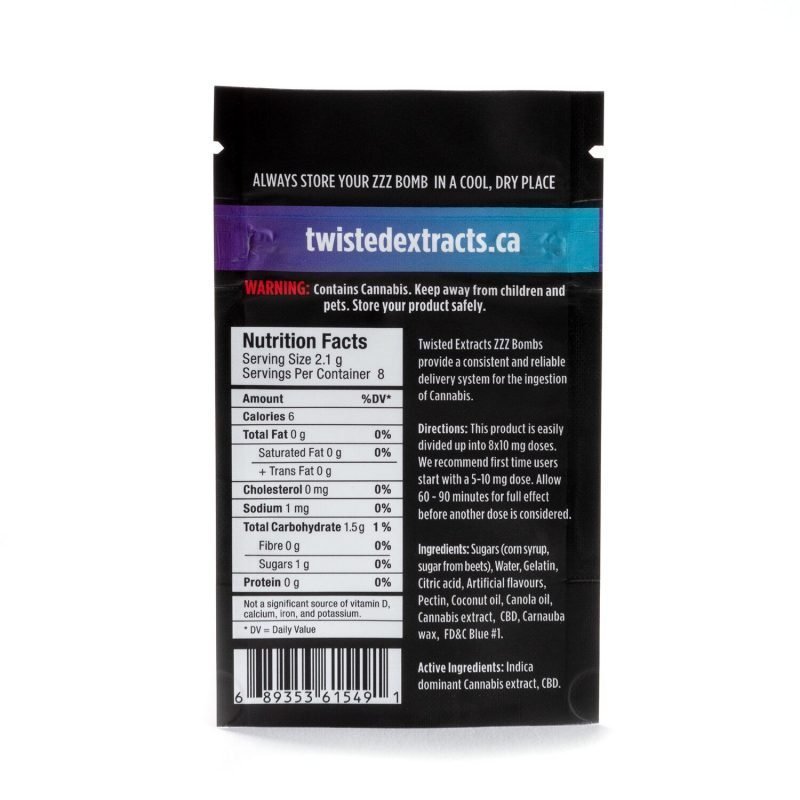 - Each Zzz Bomb is infused with 40 mg of THC derived from an indica dominant cannabis strain + 40 mg of CBD (8 x 5 mg THC + 5 mg CBD servings each).